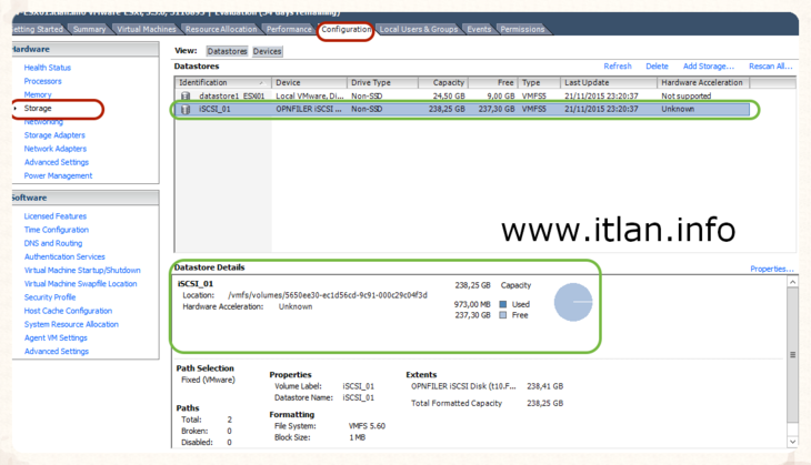 Paso 48: Ya tenemos nuestro nuevo Datastore creado en nuestro ESXi 5.5 "iSCSI_01". donde almacenaremos nuestras VM.