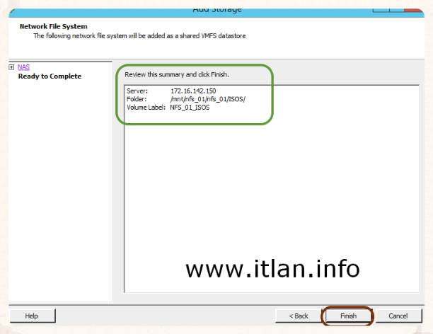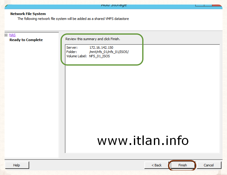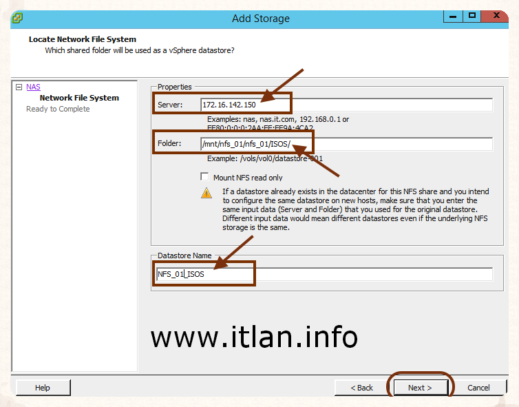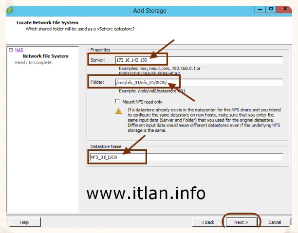 Paso 59: Introducimos los valores Server "172.16.142.150" la IP de nuestro servidor openfiler 2.99 -> Folder /mnt/nfs_01/nfs_01/ISOS/" nuestra acceso a los datos resultante del Paso 52, por último Datastore Name "NFS_01_ISOS", "Next" para continuar.
