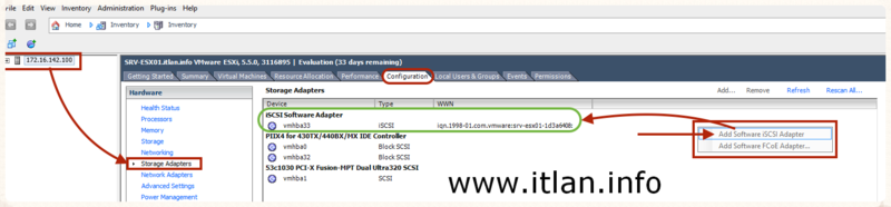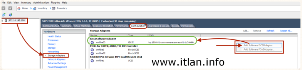 Paso 36b: Seleccionamos nuestro Host -> "Configuration" -> "Storage Adapters", pulsamos el botón derecho del ratón en el apartado blanco de la ventana y añadimos "Add Software iSCSI Adapters".