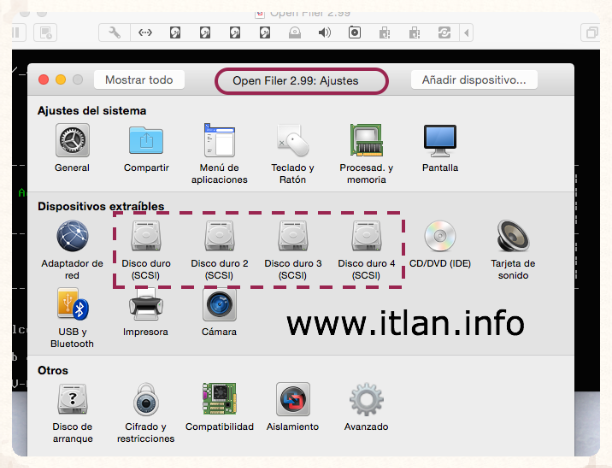 cada uno utilizara el software de virtualización disponible en su entorno, vmware FUSION, workstation, virtualBox, XenServer, etc.. ). Observar que la VM tiene creado 4 Discos iSCSI que