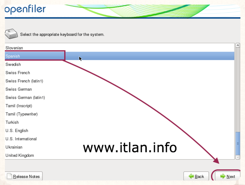 Paso 5: Seleccionamos nuestro idioma para el teclado, "Spanish" y pulsamos en botón "Next" para continuar.