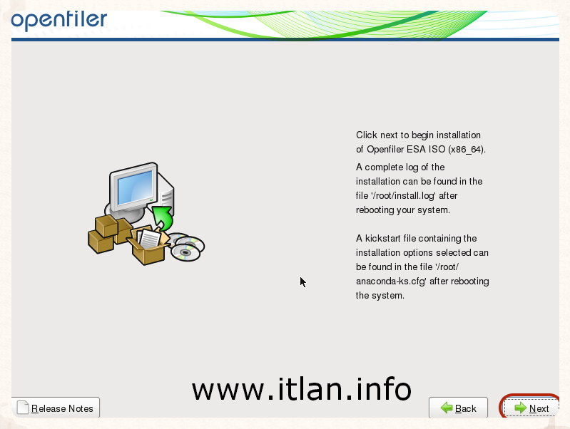 Paso 15: Pulsamos el botón "Next" para comenzar con la instalación de Openfiler 2.99.