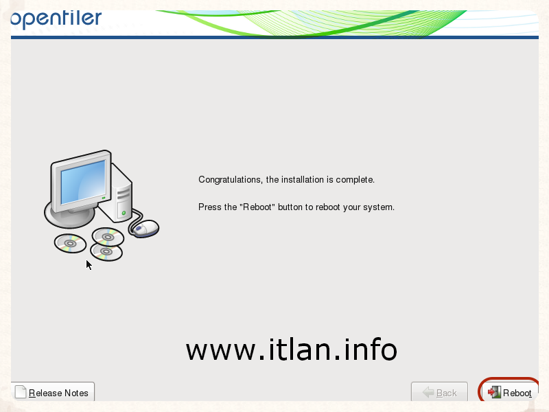 Paso 17: Una vez instalado, pulsamos el botón "Reboot" para reiniciar el sistema, si la instalación fue desde CD ya podemos retirarlo.