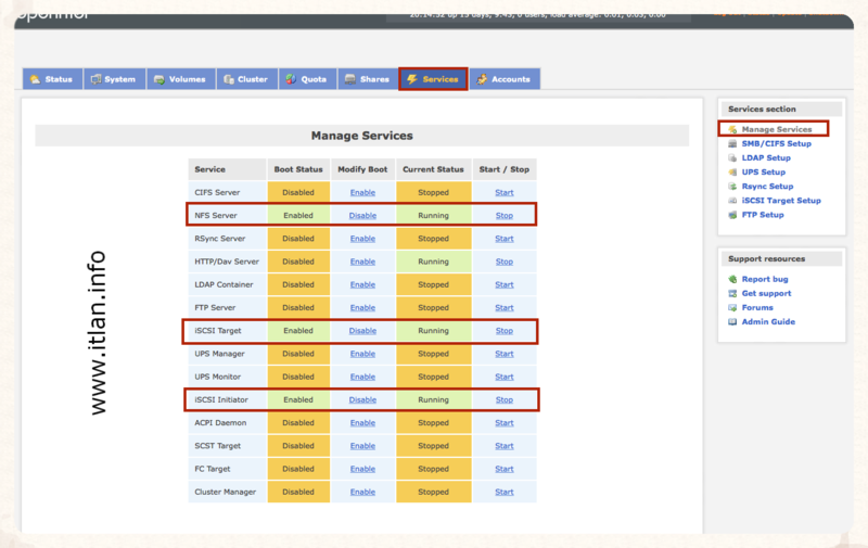 almacenamiento iSCSI, para ellos pulsamos en la pestaña "Services" -> "Manage Services" y habiliatremos los servicios que teneis recuadrados en