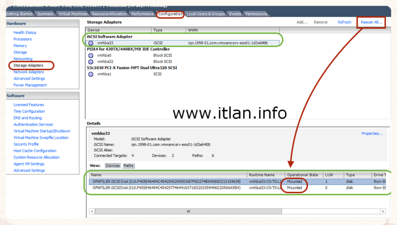 Paso 40: En el caso de no aparecer nuestras controladoras, haremos un "Rescan All..", para que vSphere Client haga un rescaneo de nuestros adaptadores y nos muestre los dispositivos nuevos disponibles.