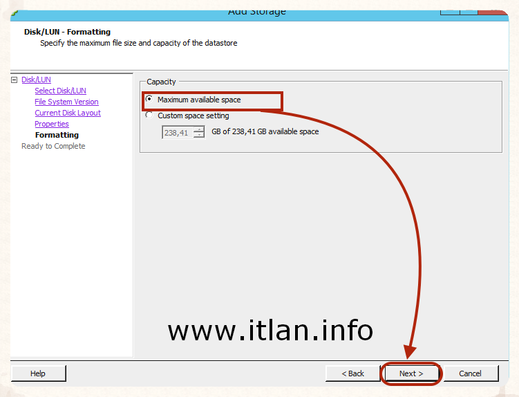 Paso 46: En esta opción podemos particionar nuestra LUN, en nuestro caso utilizaremos la capacidad máxima del disco, seleccionamos "Maximum avalaible space" y pulsamos el botón "Next" para continuar.