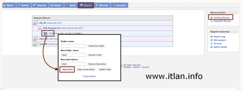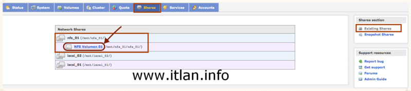 Paso 50: Nos posionamos en la pestaña "Shares" -> "Existing Shares" pinchamos en nuestro volumen "NFS Volumen 01 (/mnt/nfs_01/nfs_01/).
