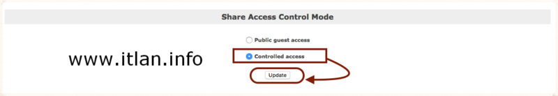 Paso 54: Configuramos nuestro acceso como Controlado, pinchamos en "Controlled access" del apartado "Share Access Control Mode" y pulsamos el botón "Update".