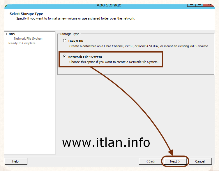 Paso 58: En este caso tenemos que seleccionar la opción "Network File System (NFS)" pulsamos el botón "Next" para continuar.