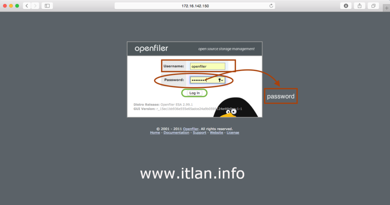 Paso 20: Abrimos nuestro navegador y vamos a la dirección que nos indica " https://direccion_openfiler:446". Para loguearnos, introducimos los valores por defecto del usuario "Username: openfiler" y contraseña "Password:password'" y pulsamos en "Log in",