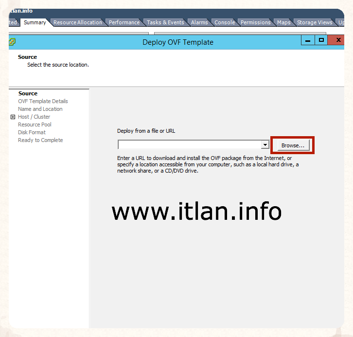 Paso 4: Se despliega una nueva ventana, pulsamos "Browse" para hacer la búsqueda de nuestra plantilla OVF "Deploy from a file or URL".