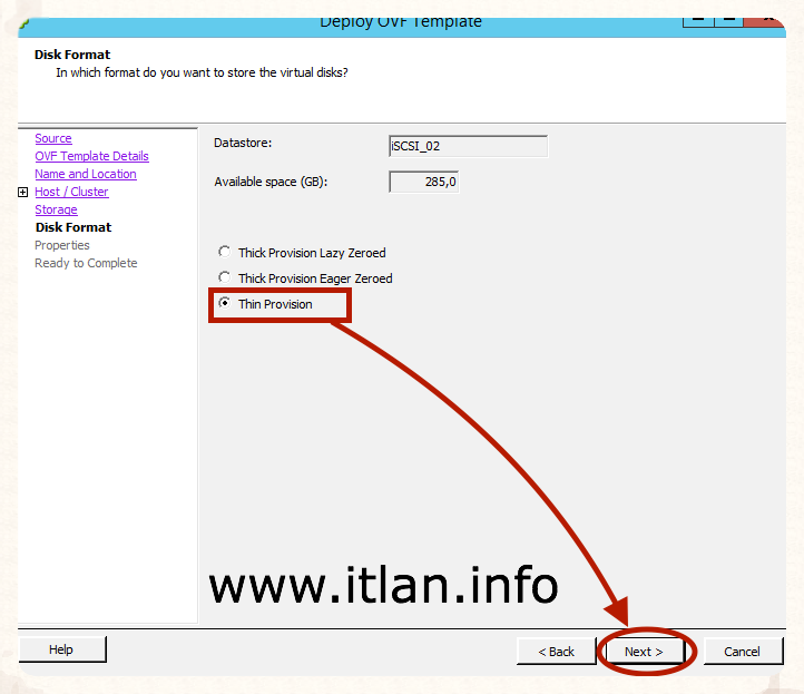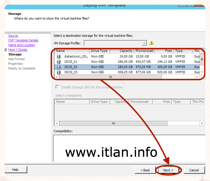 Paso 7: Seleccionamos el disco de almacenamiento donde almacenaremos nuestro Appliance, en mi caso tengo varios discos (LUN) y he seleccionado el llamado "iSCSI_02", pulsamos el botón "Next".