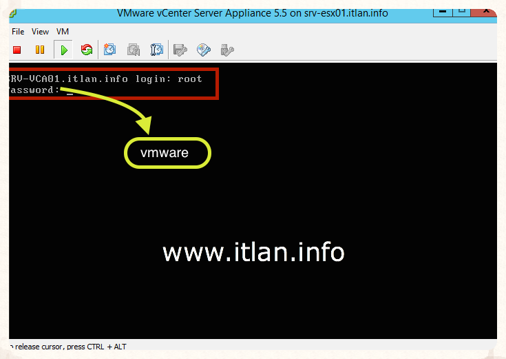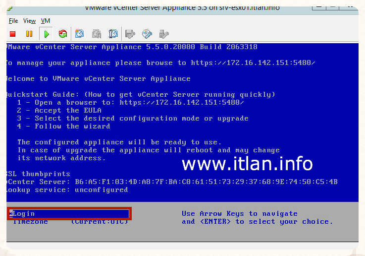 Paso 22: Nos muestra la pantalla de nuestro VCSA 5.5, hacemos "Login" introduciendo los valores por defecto "User name: root" y "Password: vmware".