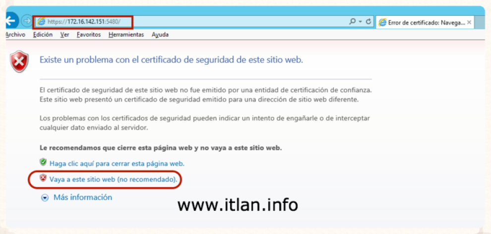 5.5. Una vez configurada la IP tendremos que acceder a la configuración vía navegador, bien por IP o nombre DNS accediendo por el puerto 5480. En nuestro caso el acceso sería de las siguientes