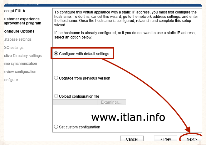 Paso 25: Nos presenta los metodos de configuración del Servidor, seleccionamos "Configure with default settings" y pulsamos el botón "Next" para empezar con la configuración.