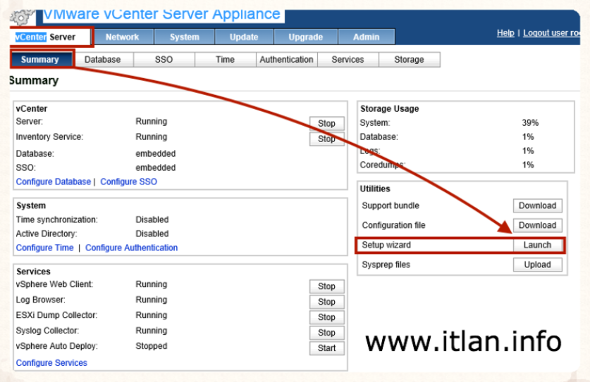 Paso 32: Volvemos a la pantalla principal "Summary" pulsamos en "Launch" dentro de "Setup wizard" para seguir configurando más opcines de nuestro VCSA 5.5.