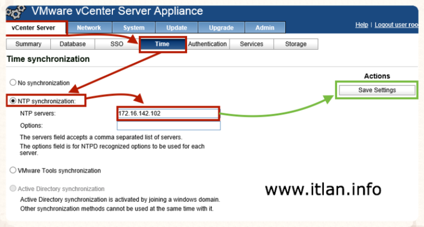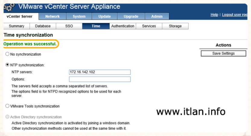 Paso 34: Seleccionamos la pestaña "vCenter Server" -> "Time", a continuación marcamos la opción "NTP synchronization" y ponemos nuestro servidor NTP que es nuestro DC de Windows 2008/12 "172.16.142.102", tambien podéis poner un servidor horario externo.