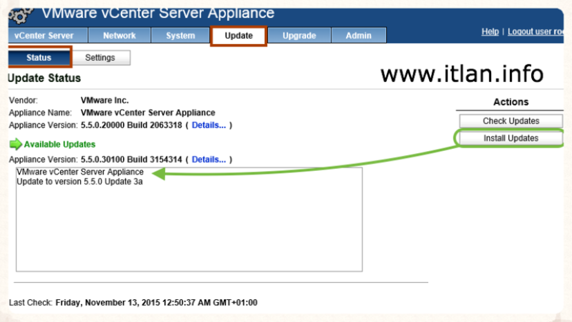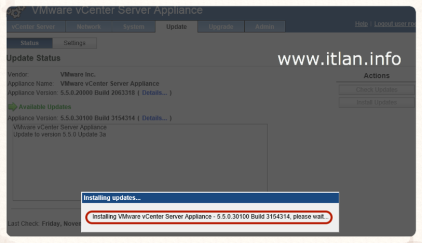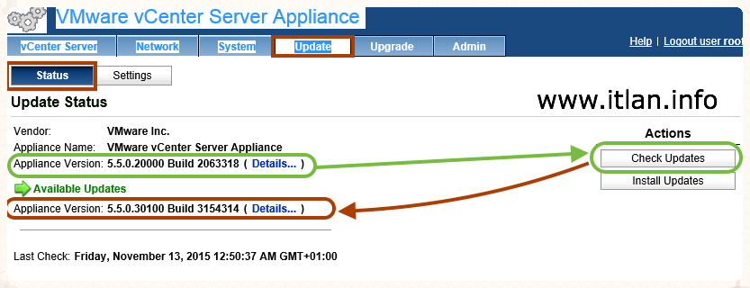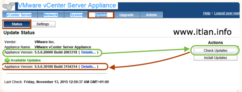 - Hacemos click en el botón "Check Updates" del apartado "Actions", conectara con vMware