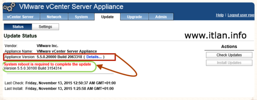 - Una vez terminado el proceso de actualizacion tendremos que reiniciar nuestro VCSA 5.5 "System reboot is required to complete the update".