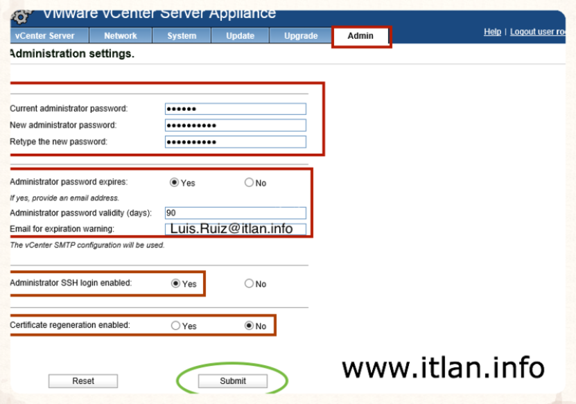 Paso 45: En ésta opción modificaremos el password de nuestro VCSA 5.5, que por defecto es "vmware". Le ponemos que expire el password en 90 días "Administrator exprires -> Yes" -"90 days", que mande un e-mail cuando expiren los 90 dias.
