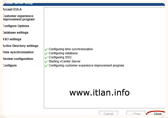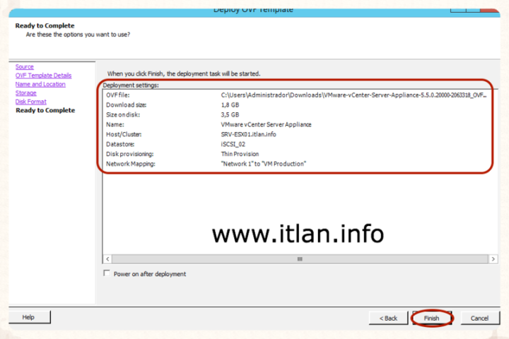 Paso 9: Por último se nos mostrara un resumen de la configuración, si es todo correcto pulsar el botón "Finish" y empezara el despliegue de vCenter.