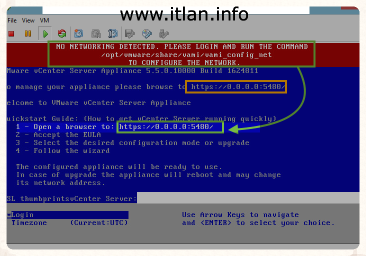 Paso 15:En el caso de no tener un servidor DHCP para asignar IP’s, veremos esta advertencia de que no tenemos la red configurada. Para proceder a la configuración pulsamos la tecla "ENTER" para acceder al VCSA 5.5.