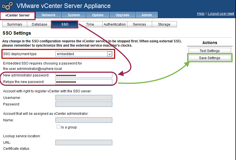 Paso 46: Nos posicionamos en la pestaña "vCenter Server" -> ficha "SSO", seleccionamos "embebed" de la opción "SSO deployment type" y escribimos una contraseña para el usuario administrador administrator@vsphere.local, finalizar "Save Settings"