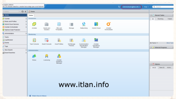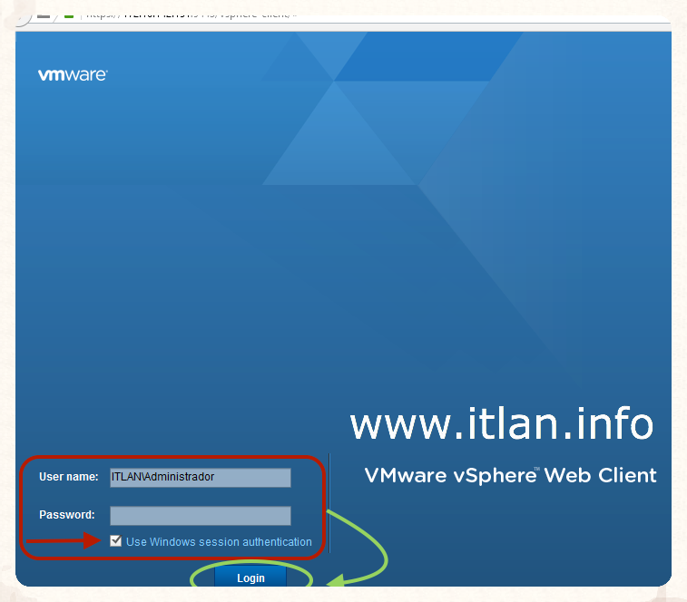 Paso 51: Una vez integrado el plugin, solo tendremos que marcarlo y automáticamente aparecerá el usuario activo, en nuestro caso "ITLAN\Administrador" a continuación pulsamos "Login" para acceder a nuestro VCSA 5.5.