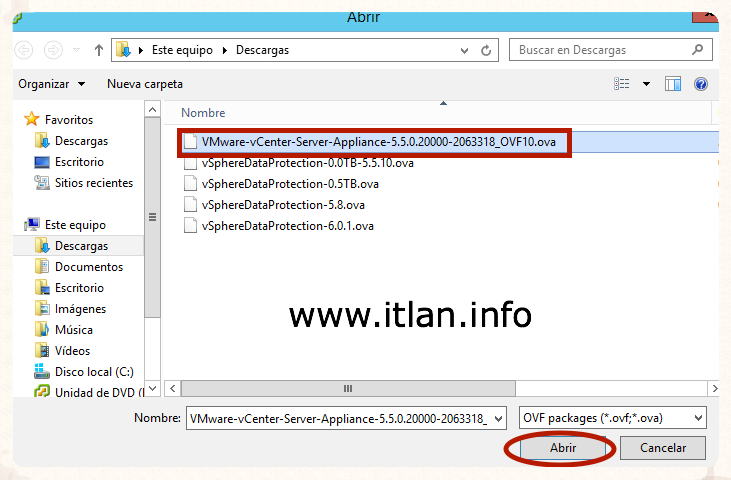 Paso 5: Buscamos nuestra plantilla donde la hayamos guardado, después de descargarla de la pagina de vmware.com, seleccionamos el fichero "*.ova" y pulsamos el botón "Abrir".