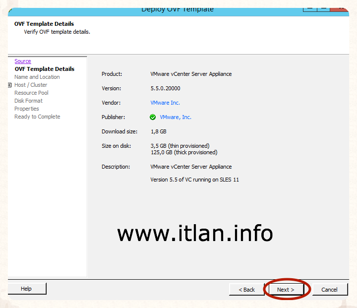 Paso 6: Nos muestra la información del paquete seleccionado, "Product", "Size en Disk" y "Version : 5.5", a continuación pulsamos el botón "Next".