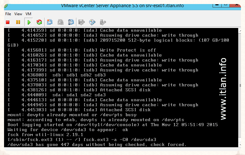 Paso 13: Nos posicionamos en la pestaña "Console" de nuestra VM y podremos observar el proceso de carga de nuestra VM en Linux VCSA 5.5