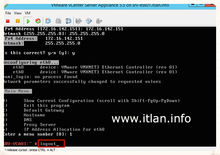 Paso 20: Una vez configurada la red, debemos de pulsar la opción "1" para salir del menú y después escribimos el comando "logout" para salir del terminal de comandos. Si todo esta bien configurado os tendrá que salir la imagen del Paso 14 con la IP "Ok".