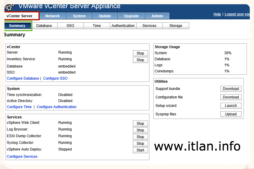Paso 29: A continuación nos saldra la siguiente ventana, la cual nos muestra un resumen de la configuración principal. Pestaña "vCenter Server" -> "Summary", ya tenemos una parte de la configuración creada correctamente y los servcios en "Running".