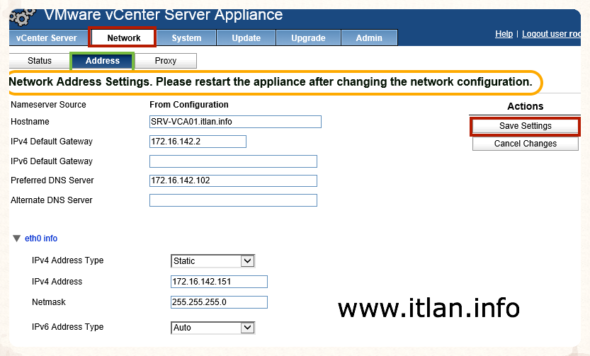 Paso 31: Si los datos no son los correctos y tenemos que modicarlos "uno o varios", nos posicionamos en "Network" -> "Address" realizamos el/los cambios y pulsamos el botón "Save Setting" para almacenarlos en la BB.DD. Nos pedira que reiniciemos el VCSA.