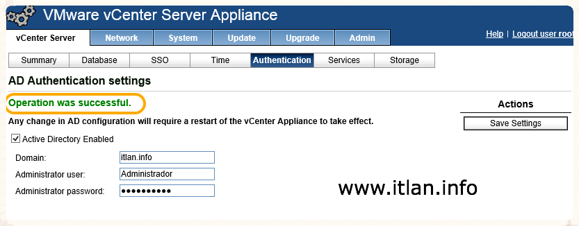 en la pestaña de "vCenter Server" y la ficha "Authentication". En el apartado "AD Authentication settings" marcamos la casilla "Active