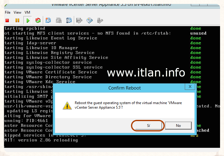 Paso 47: Por último después de configurar nuestro VCSA 5.5 procedemos al reinicio, para que carguen todos lo valores modificados durante la configuración.