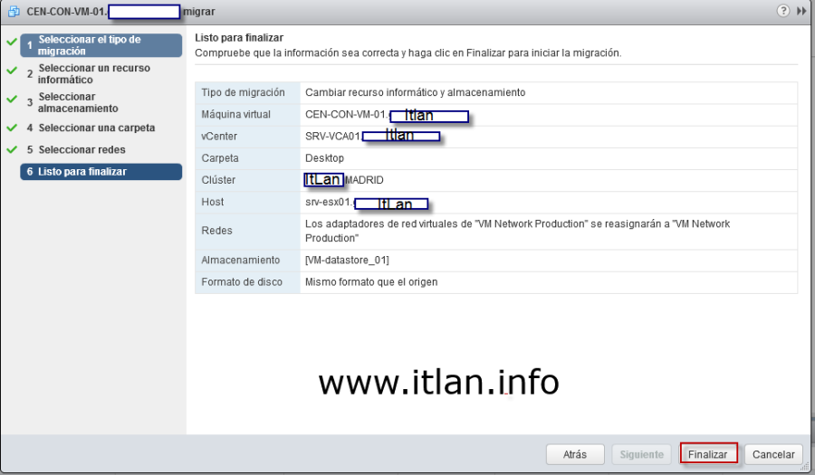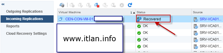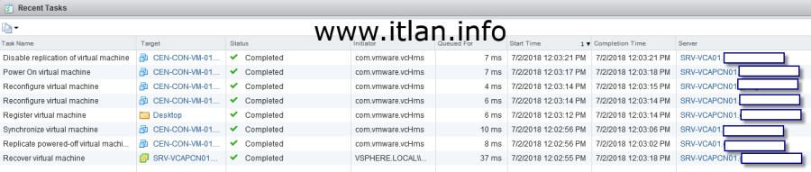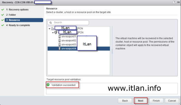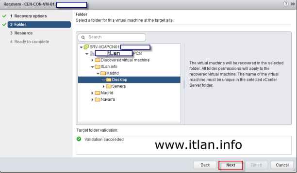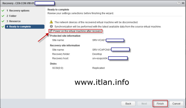 Si el sitio de origen está disponible y la máquina virtual está encendida en el sitio de origen, los dispositivos de red de la máquina virtual recuperada se desconectaran. Es posible que tengáis que modificar la máquina virtual recuperada para que sea completamente operativa. Seleccionamos el check de verificación si deseamos encender la máquina virtual después de la recuperación, pulsamos el botón “Finish” para finalizar.