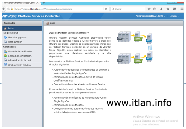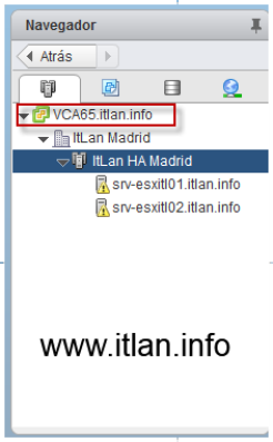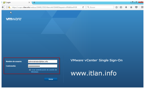(https://IP_o_FQDN_Appliance/vsphere-client), donde nos validaremos inicialmente con el usuario administrator@itlan.info (o con el dominio SSO configurado por vosotros, por defecto