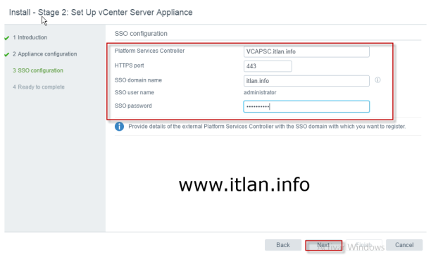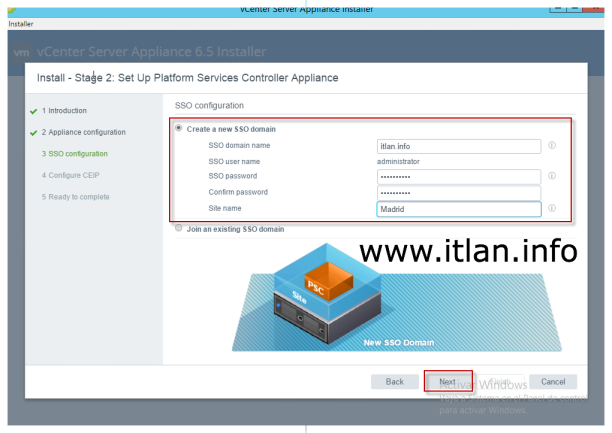 Paso 32: Introducimos los datos solicitados, PSC instalado anteriormente, dominio SSO y datos del usuario Administrator y Password introducidos en el Paso 14.