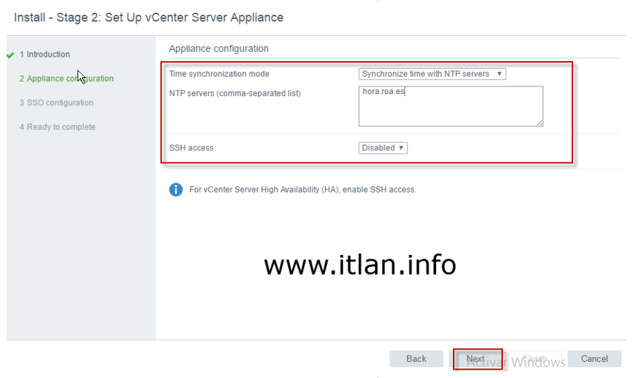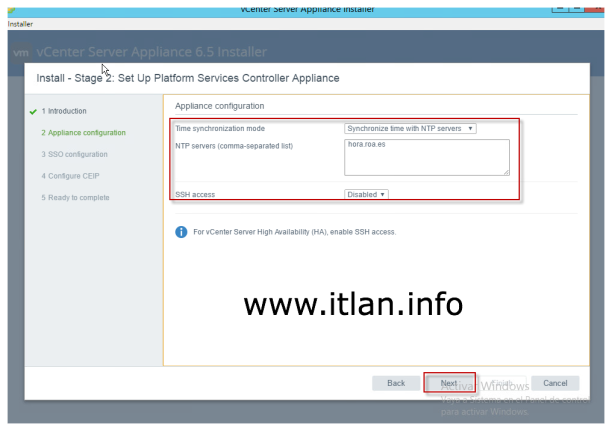 Paso 13: Debemos especificar como se realizaremos la sincronización horaria, ya sea sincronizando la hora con el Host ESXi, o usando un servidor NTP. En nuestro caso utilizaremos el servidor NTP "hora.roa.es", vmware recomienda usar servidores NTP.