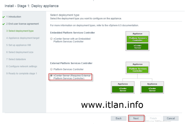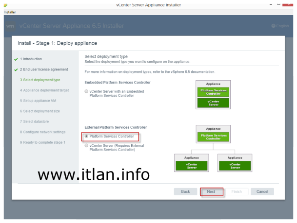 Paso 4: A continuación seleccionamos nuestro despliegue PSC External. Este será el primer componente a instalar, antes de proceder al despliegue del vCenter Server 6.5 .