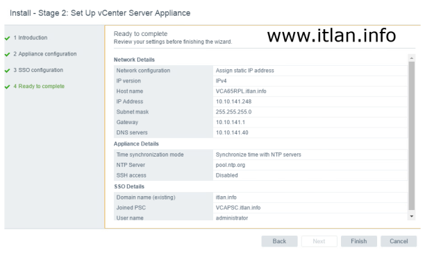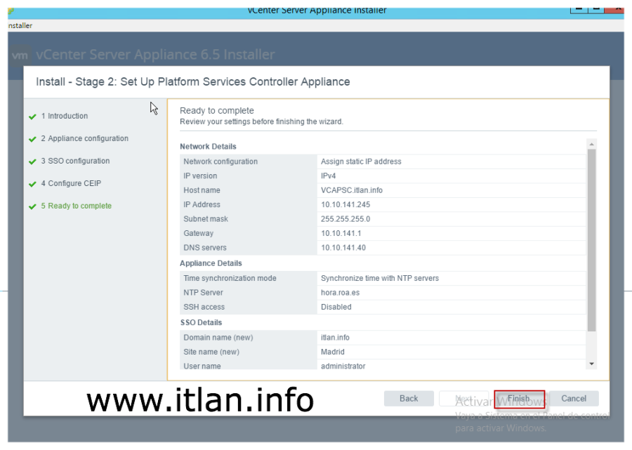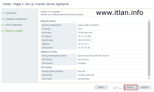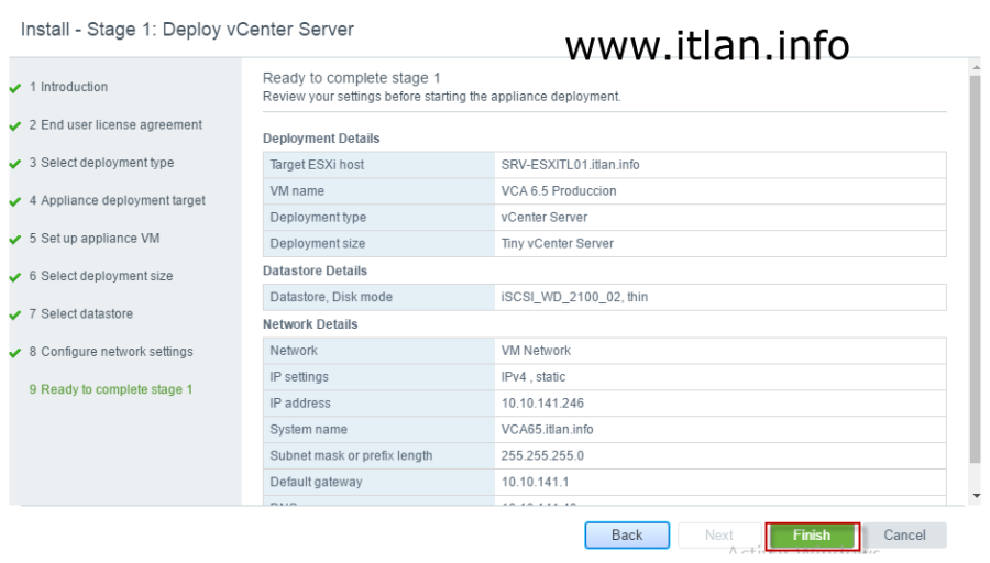 Paso 10: A continuación revisamos todos los parametros introducidos anteriormente y verificamos que son correctos, pulsamos el botón "Finish" para completar la primera etapa del despliegue.