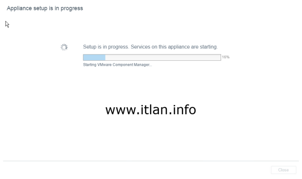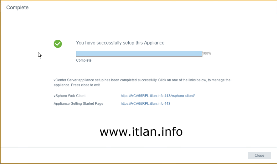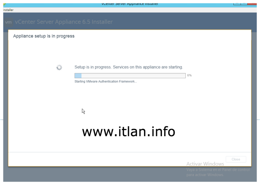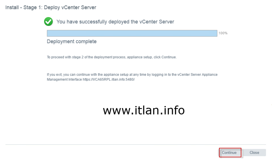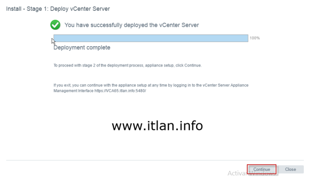 "Close", podremos reanudar la segunda etapa de la instalación en cualquier momento simplemente ejecutando la interfaz de instalación del vCenter Server Appliance. En