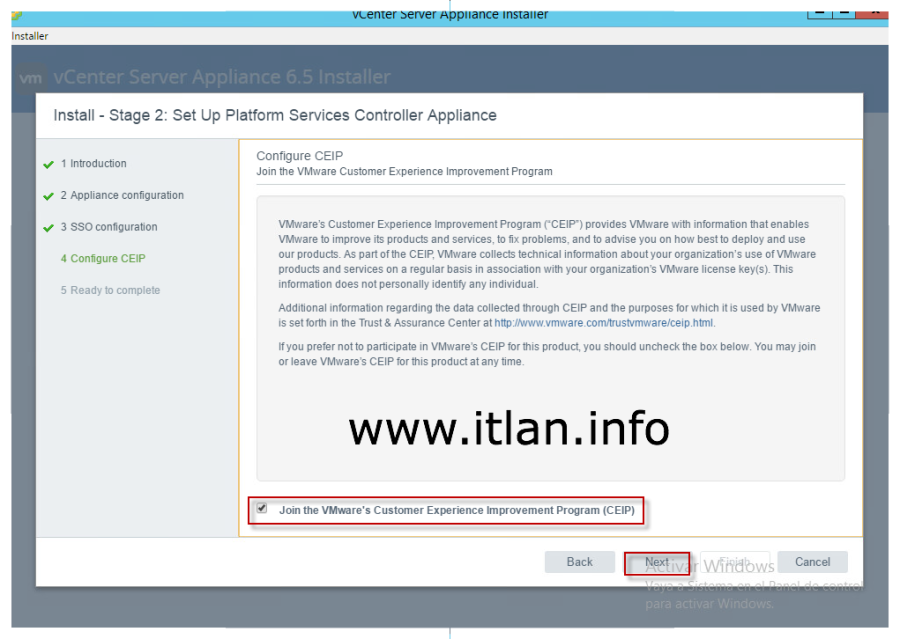 Paso 15: Nos solicita si aceptamos o no participar del programa de mejoras de la experiencia de usuario de VMware o CEIP (Customer Experience Improvement Program), yo siempre intento aportar mi granito. Pulsamos el botón "Next" para continuar.