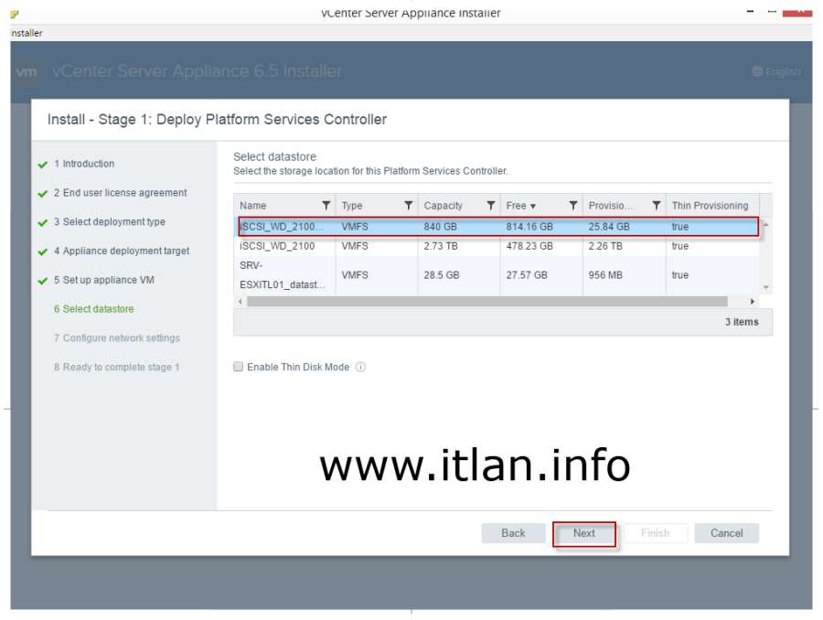 Paso 8: Especificaremos el Datastore donde almacenaremos el Appliance. Pulsamos "Next" para continuar.