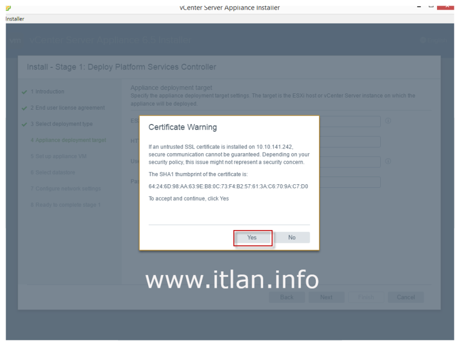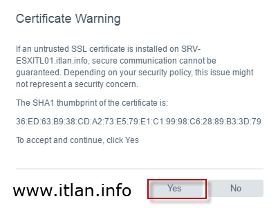 Paso 22: Aceptamos el Certificado SSL de nuestro Host ESXi de instalación y pulsamos "Yes" para continuar.