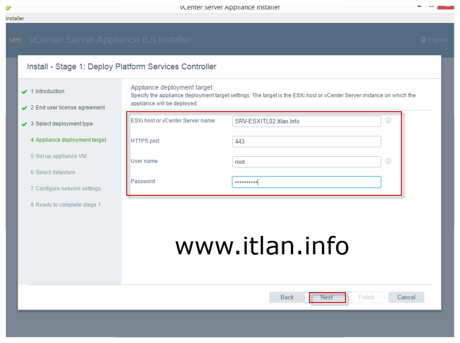 Paso 5: A continuación introduciremos el FQDN o IP del servidor ESX donde desplegaremos nuestro PSC, por el puerto 443. Introduciremos las credenciales de nuestro host ESX 6.5, el host debe de ser 5.5 o posterior pulsamos "Next" para continuar.
