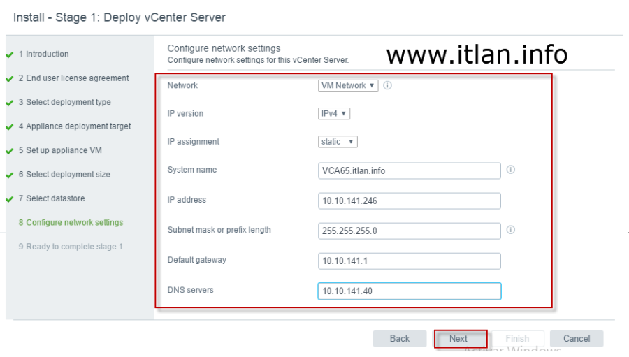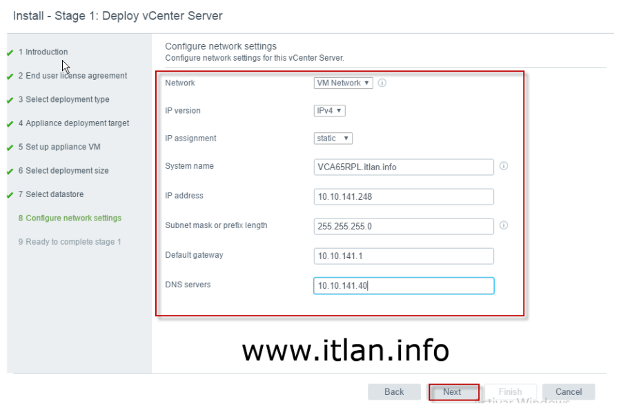 Paso 9: A continuación introduciremos los datos de Red de nuestro Appliance, tener en cuenta que el nombre FQDN (System Name) debe de estar registrado en el DNS, en caso contraio la instalación dara error. Pulsamos "Next" para continuar.
