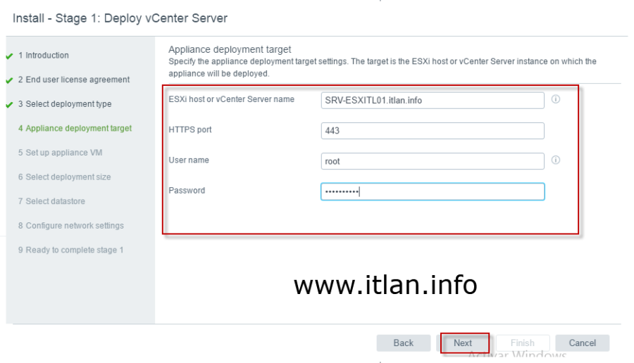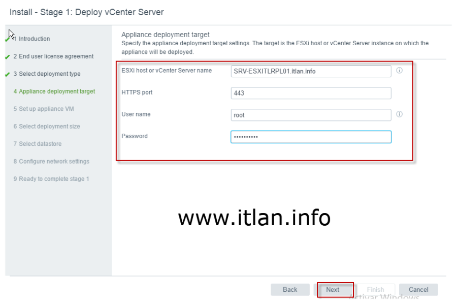 Paso 21: A continuación introduciremos el FQDN o IP del servidor ESXi donde desplegaremos nuestro vCenter Appliance, por el puerto 443. Introduciremos las credenciales de nuestro host ESX 6.5, el host debe de ser 5.5 o posterior pulsamos "Next" para conti